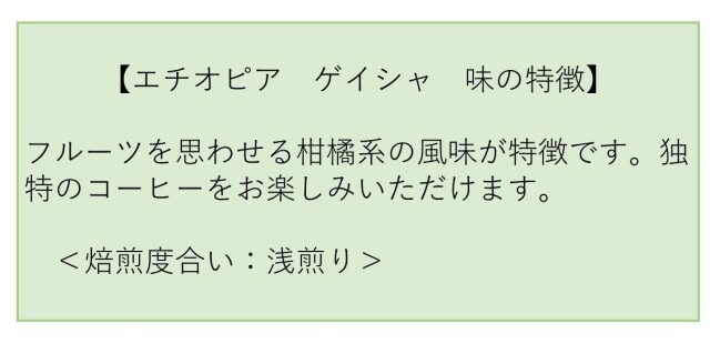 ゲイシャはパナマ産が有名ですが、発祥はエチオピアのゲイシャ村と言われており、ゲイシャの持つ独特の味を存分にお楽しみいただけます。 ゲイシャ種の持つな甘酸っぱい香り、フルーツを思わせる風味が特徴で、柑橘系の風味が後味を一層引き立てます。素晴らしい余韻が特徴的です。
